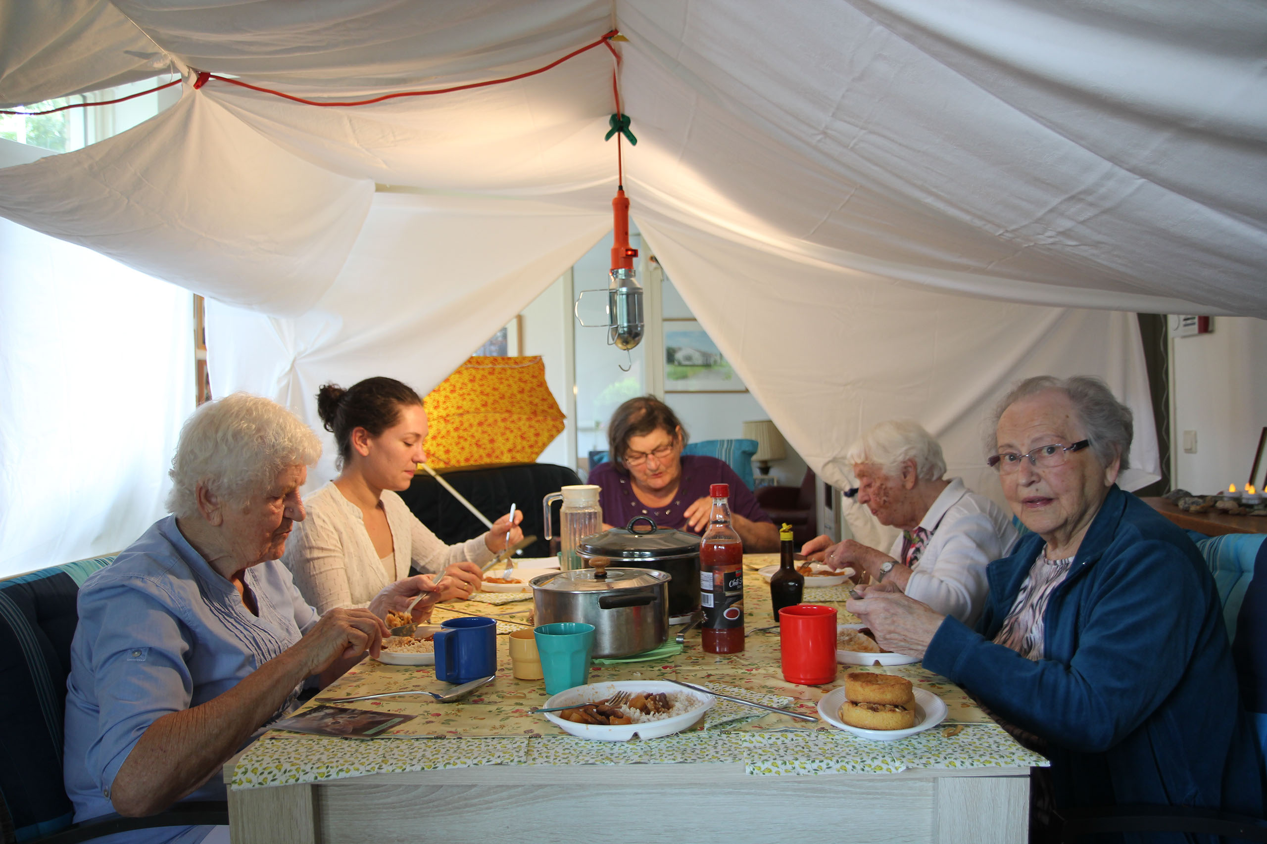 Mevrouw Van der Linden houdt erg van kamperen en geniet met name van het samenzijn wat daarbij komt kijken. Kamperen gaat op de oude dag niet meer zo goed, maar samen met Kim, een productontwerpster met veel kennis van textiel, is ze op zoek gegaan naar de essentie van kamperen. Het duo is aan de slag gegaan met het bouwen van een grote tent in het appartement van mevrouw Van der Linden, waarbij meerdere medebewoners waren uitgenodigd om te komen eten. Hieruit heeft het duo geconcludeerd dat sociale interactie en het zoeken naar inventieve oplossingen tijdens het kamperen belangrijke focuspunten waren voor hun project.